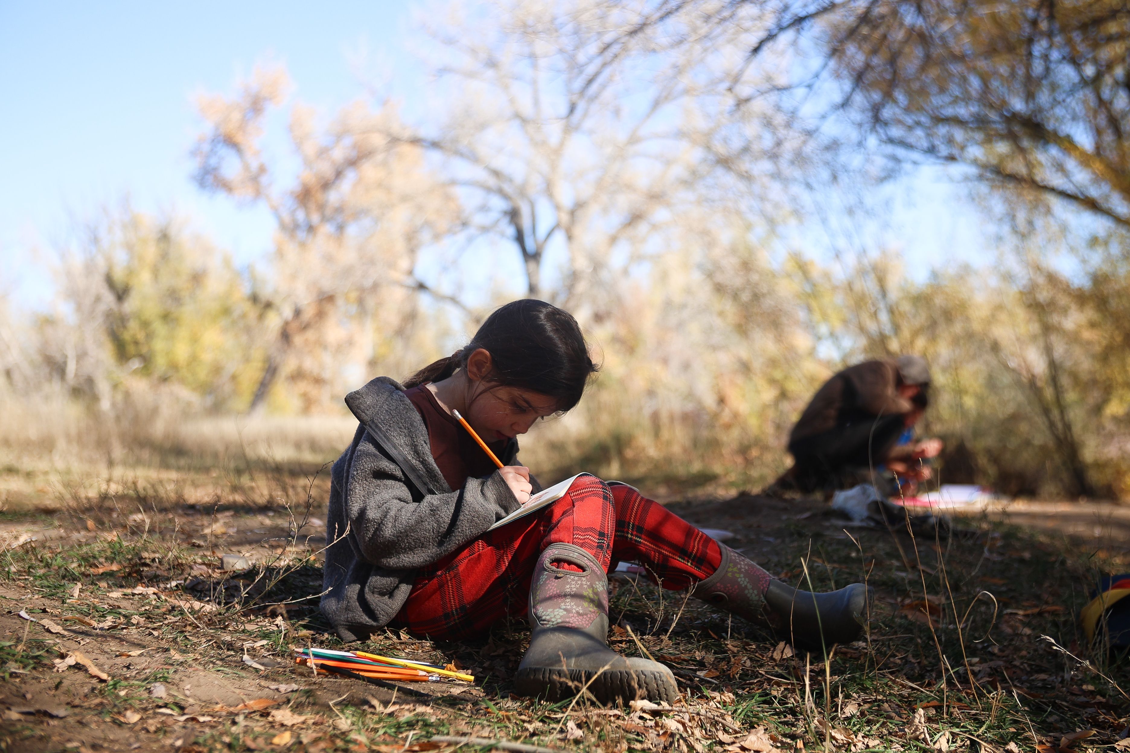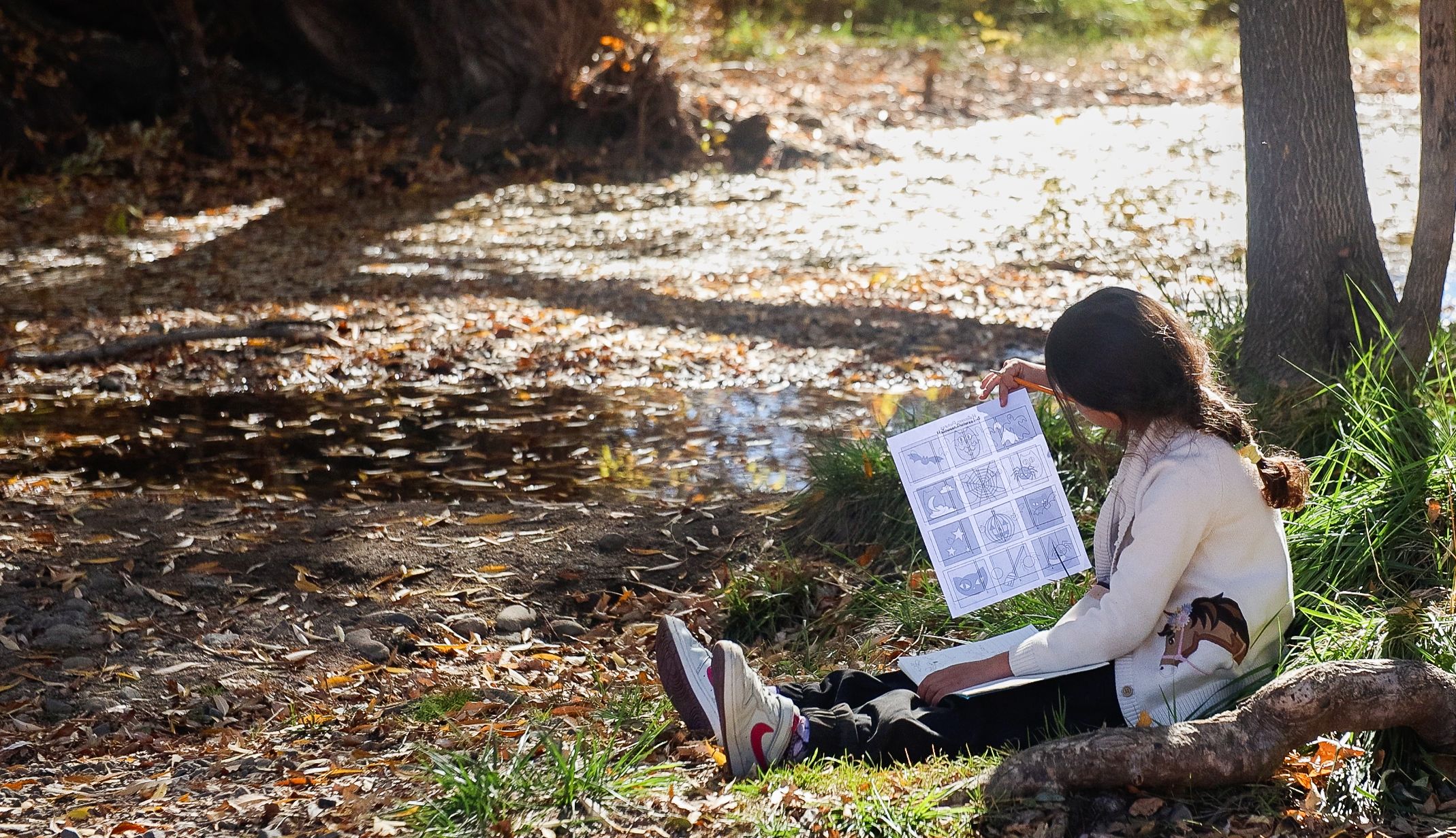 A young girl works on a Halloween worksheet next to the creek in Louisville, Colorado, October 29, 2025. (Izabelle Stewart-Adams CU NewsCorp).