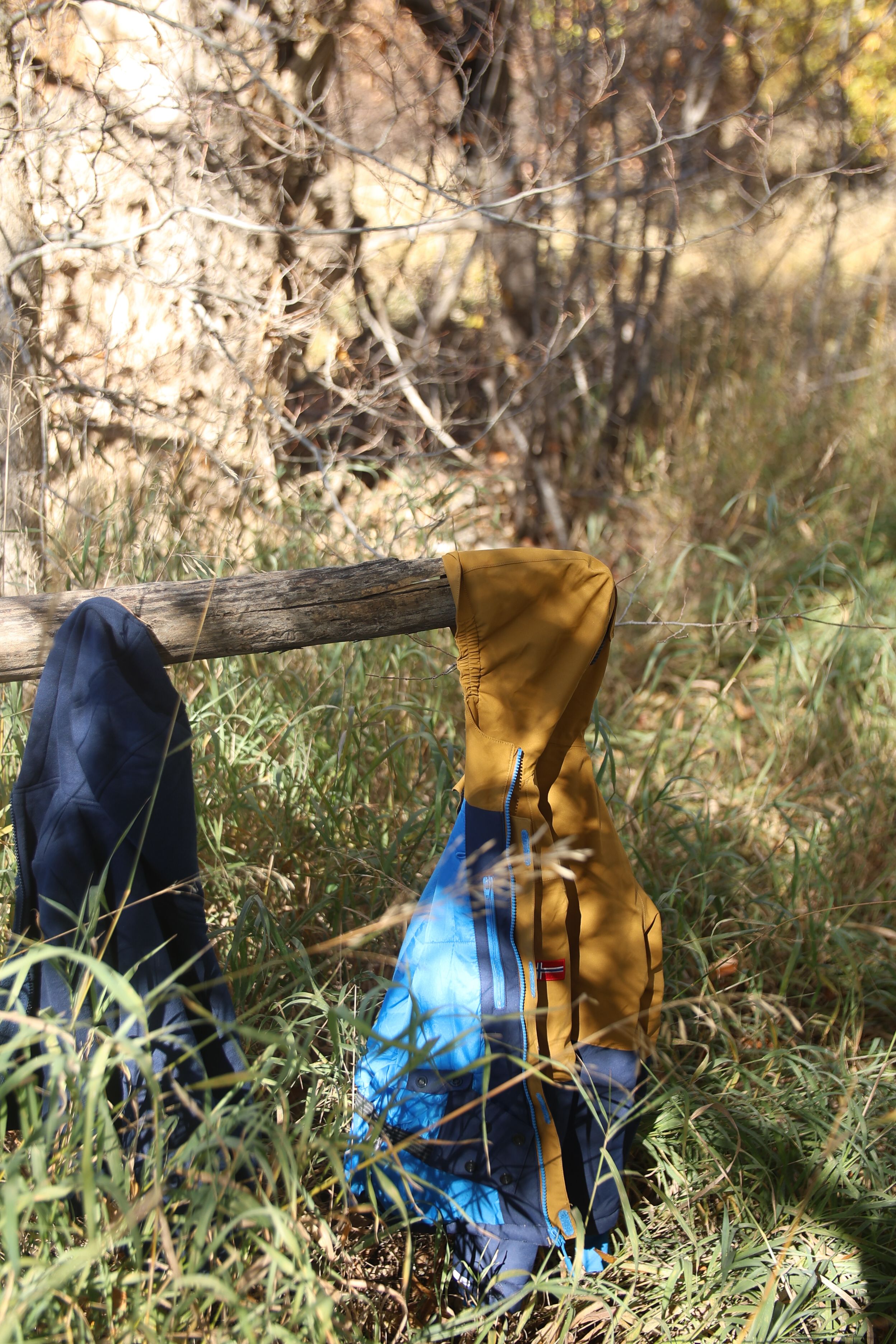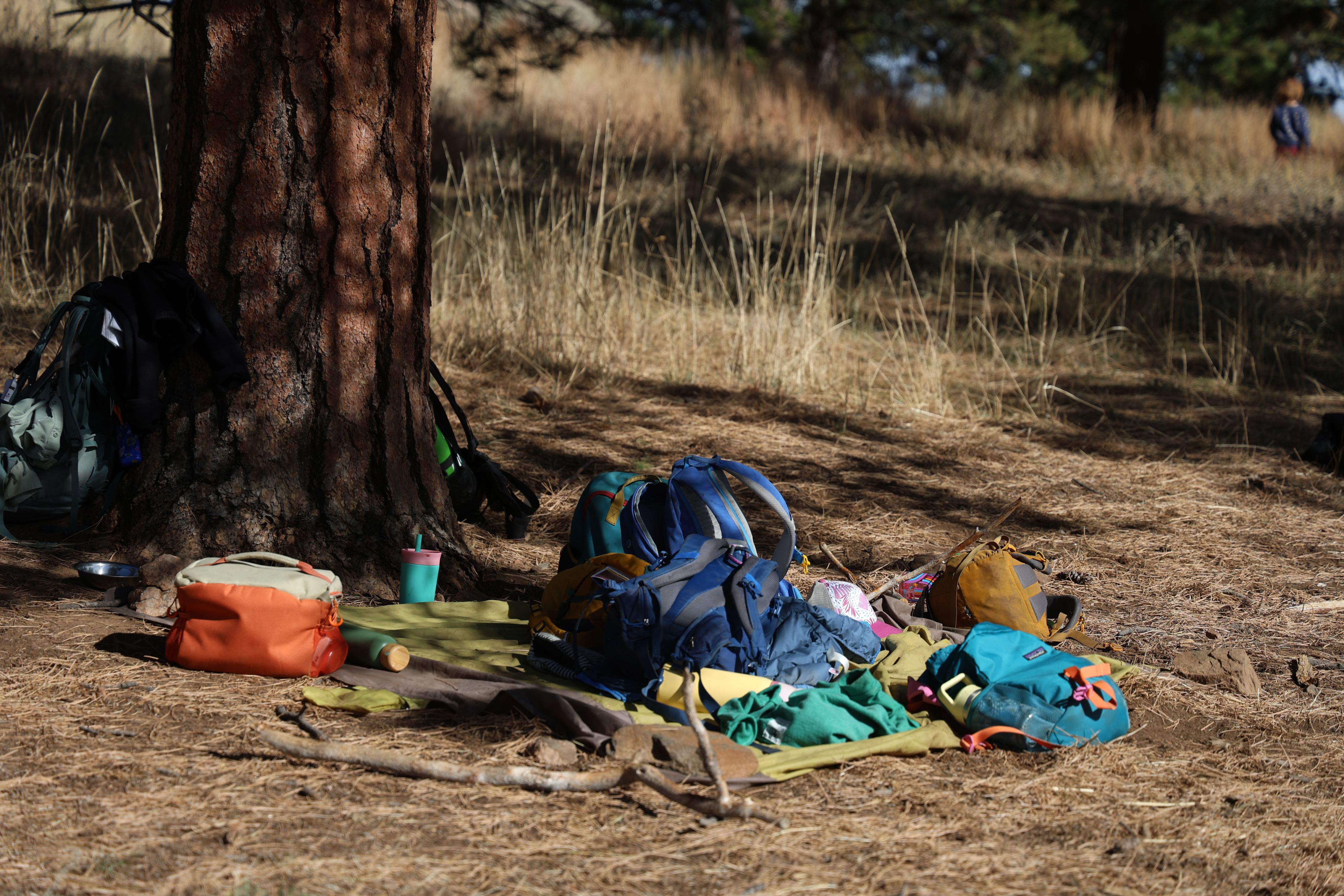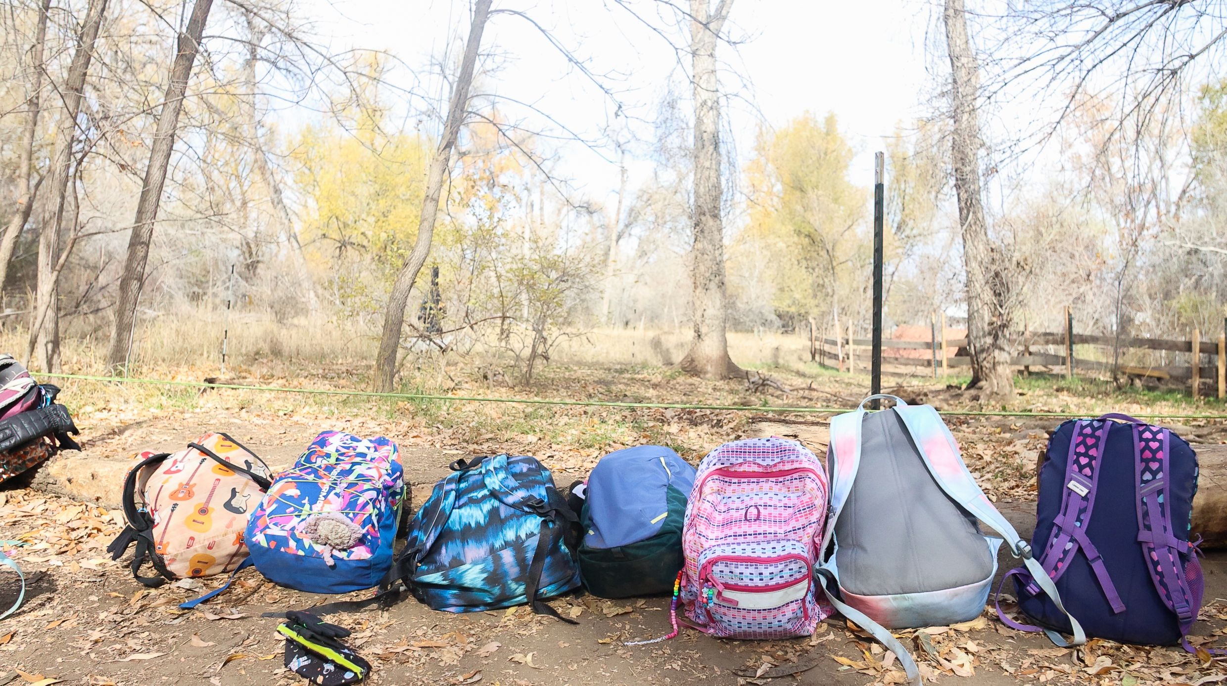 Backpacks are lined up on the land as kids explore the nearby creek in Boulder, Colorado, November 3, 2025. (Izabelle Stewart-Adams CU NewsCorp).