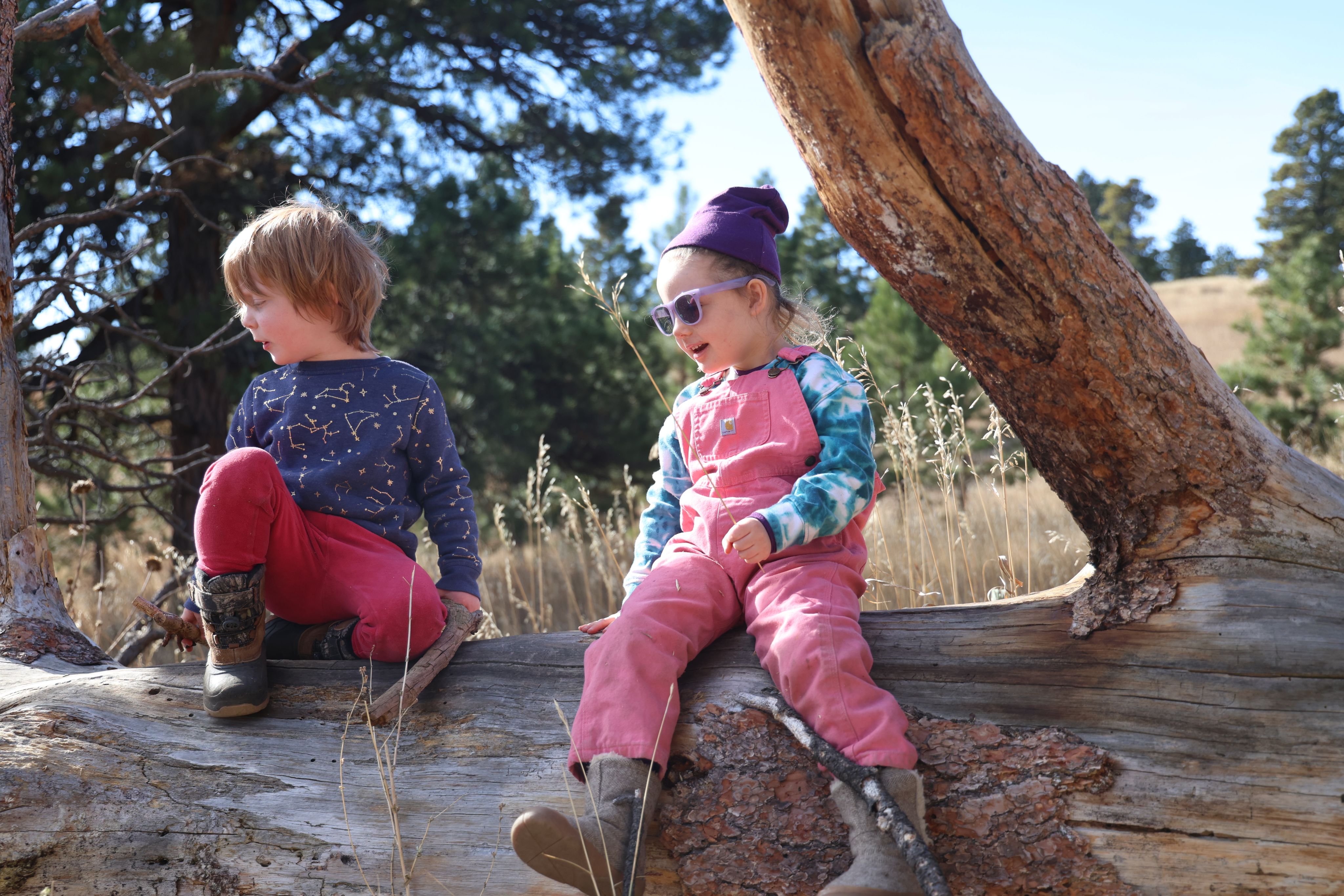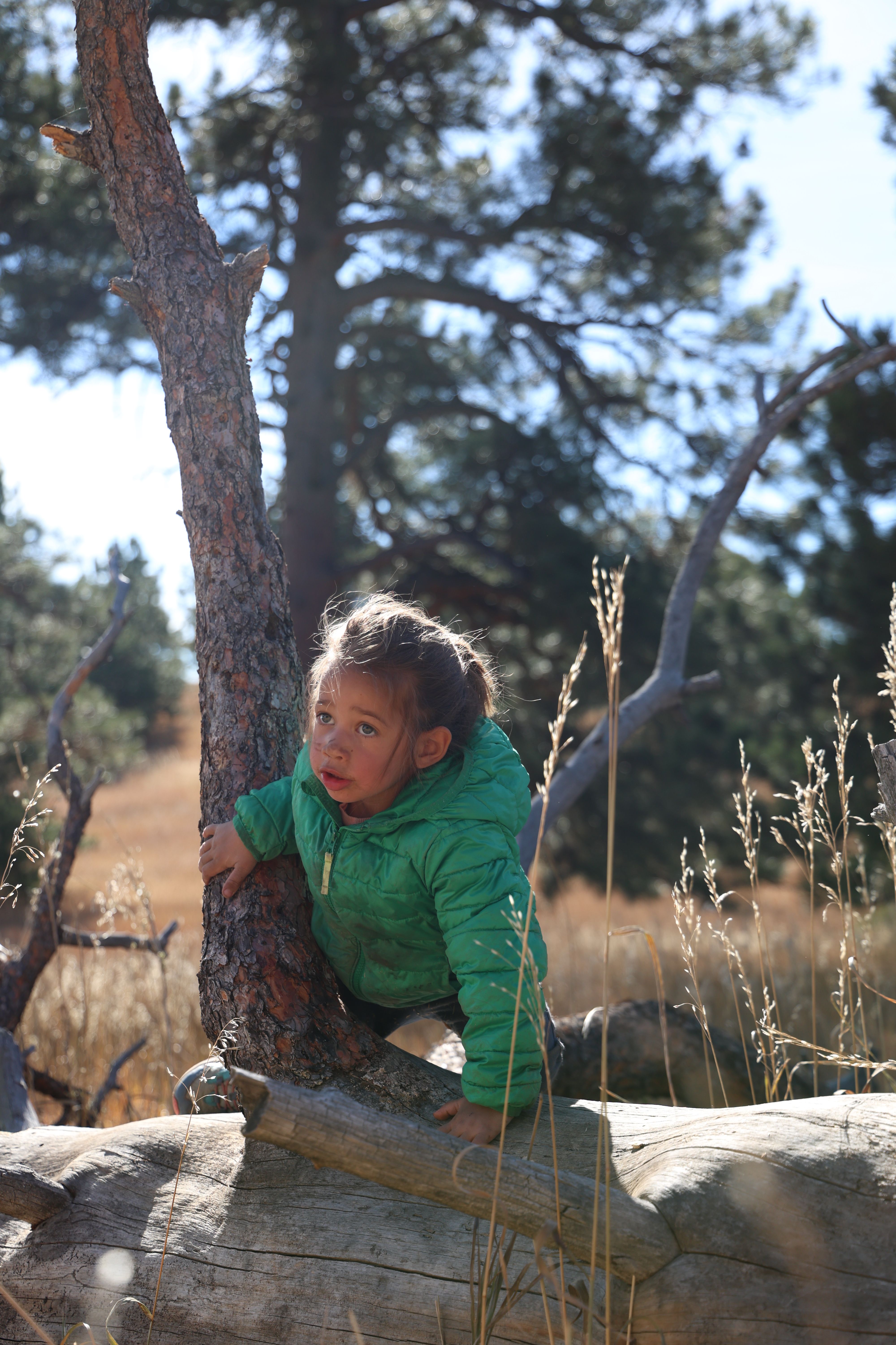 Young girl is climbing a fallen tree in Golden, Colorado, November 10, 2025. (Izabelle Stewart-Adams, CU News Corps).