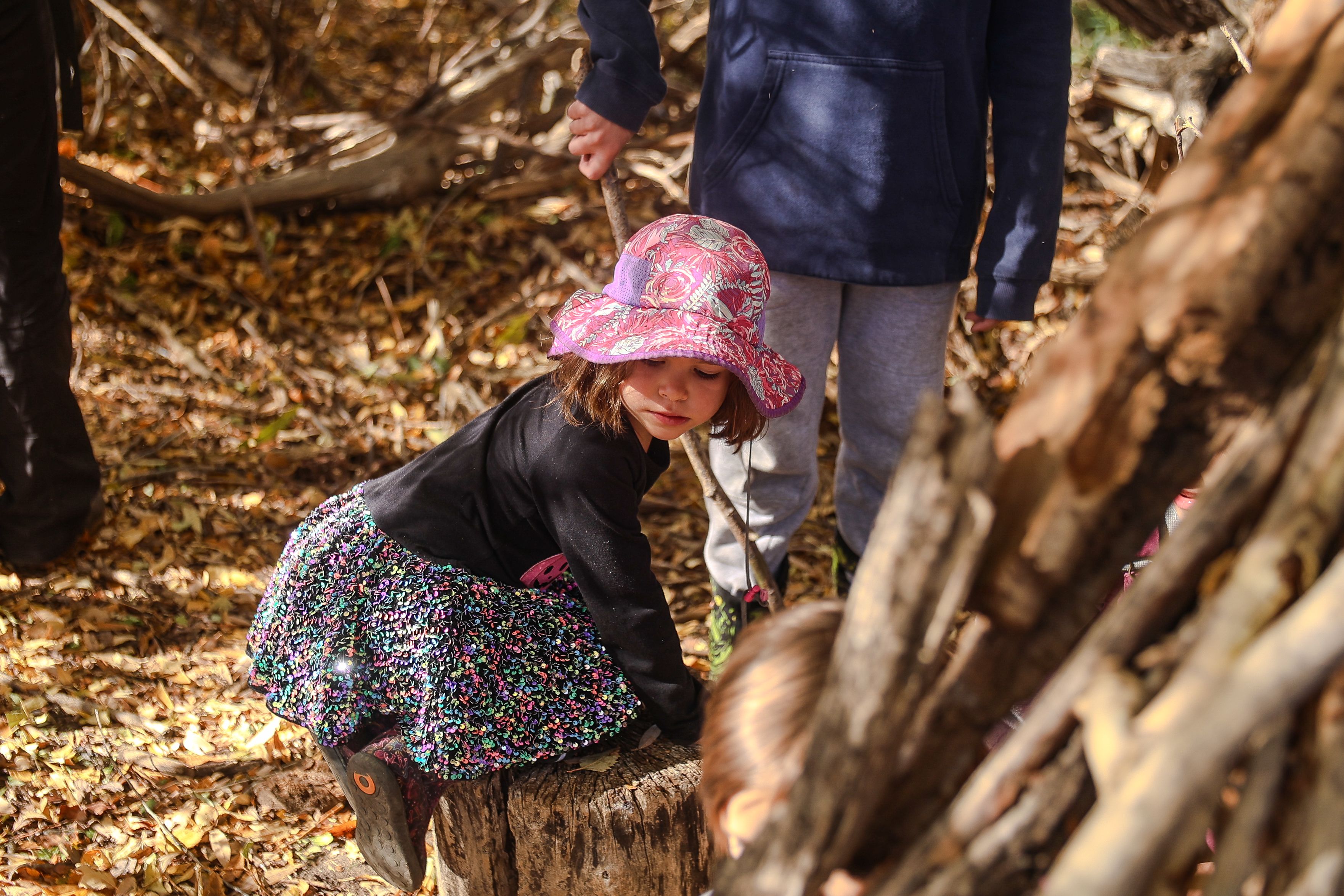 A young girl climbs on top of a log during free play in Louisville, Colorado, October 29, 2025. (Izabelle Stewart-Adams CU NewsCorp).