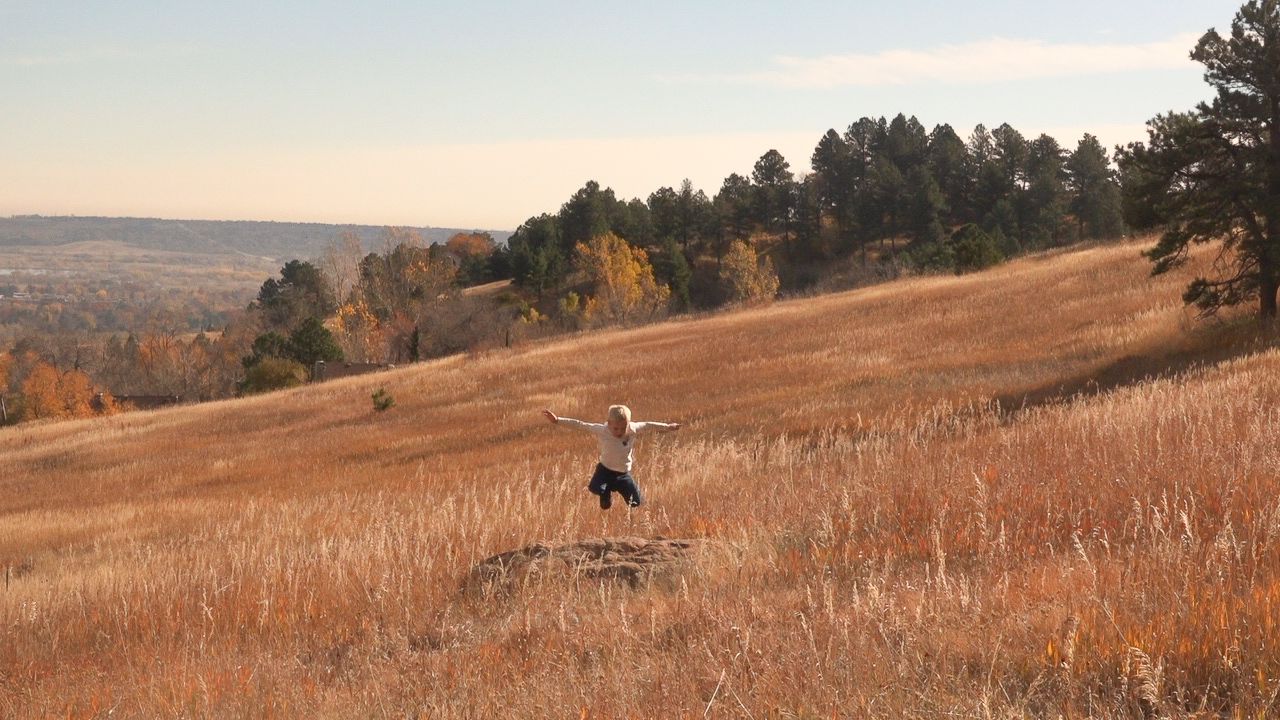 A young boy leaps from a rock in Chautauqua Park in Boulder, Colorado, November 9, 2025. (Izabelle Stewart-Adams CU NewsCorp).