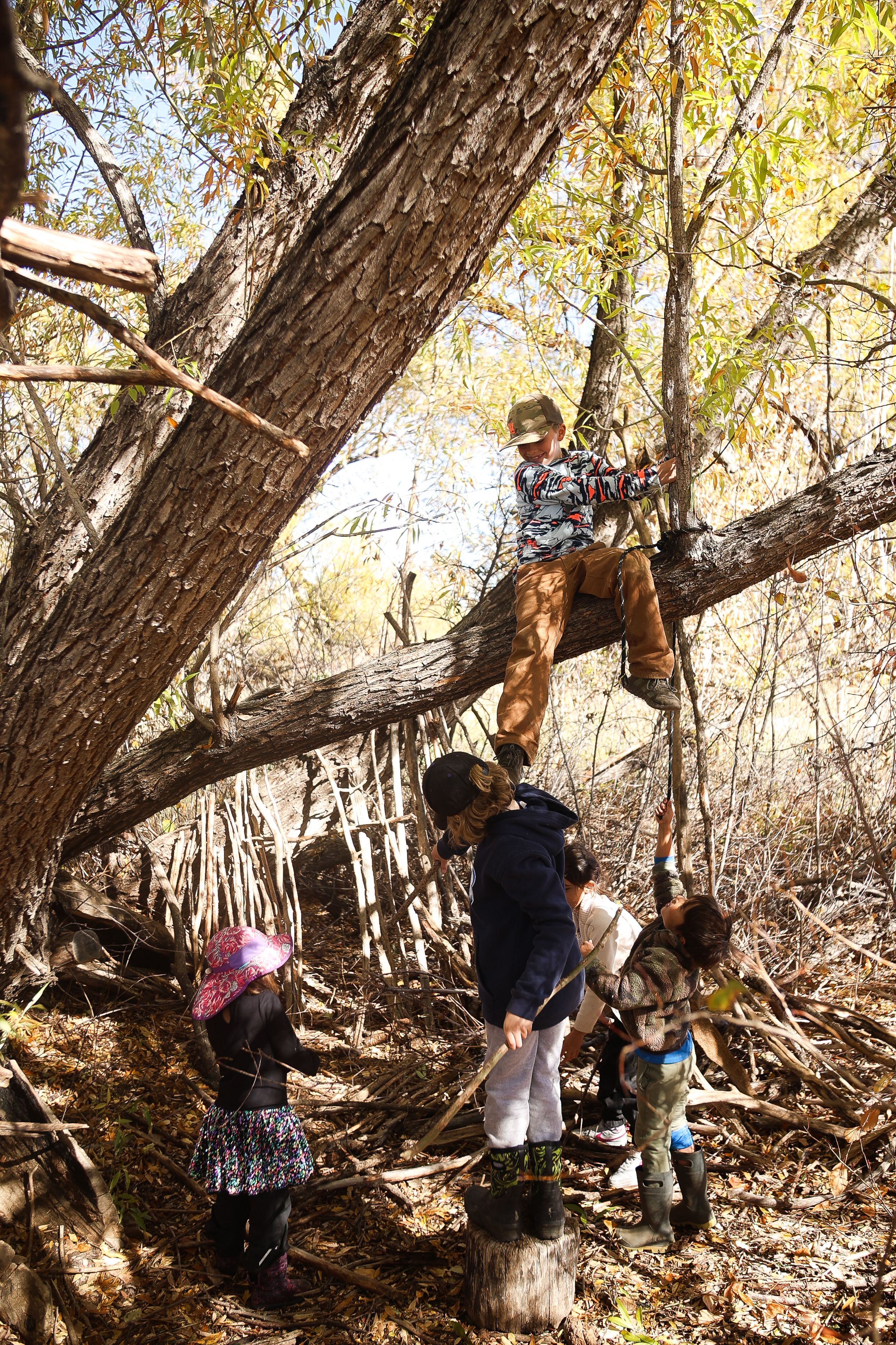 Heartseed kids climb and build tree forts during play time in Louisville, Colorado, October 29, 2025. (Izabelle Stewart-Adams CU NewsCorp).