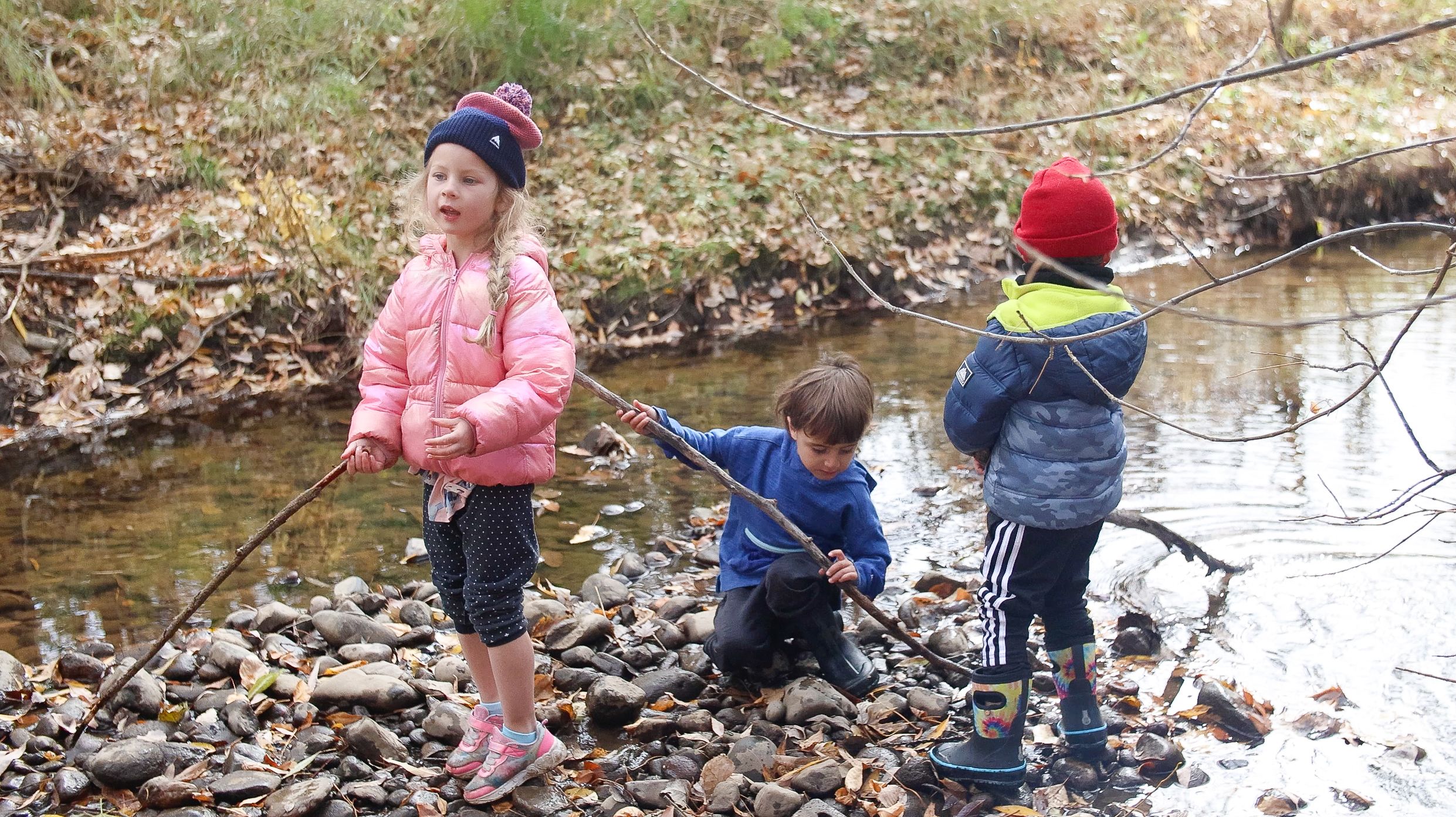 The student walks through the woods with two of his fellow classmates, following their guide, while observing the land around them. The group approaches a small secluded creek, and Ryder, wearing a red stocking cap and rain boots, jumps onto a small rocky island with a large stick in hand. He pretends he is on a boat, using the stick as his paddle, and his two friends as shipmates. Each has their own destination, but they all work together.